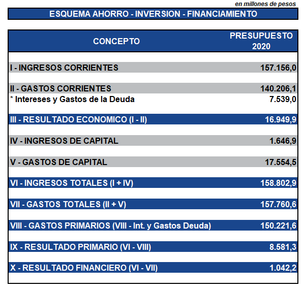 La diferencia entre los ingresos corrientes y los gastos corrientes se denomina Resultado Económico, o Ahorro Corriente, el cual expone el balance de las transacciones corrientes de un ejercicio fiscal en virtud de los diversos procesos productivos que encaran los organismos públicos. Para el ejercicio 2020 este resultado se ha estimado en $16.949,9 MM.-